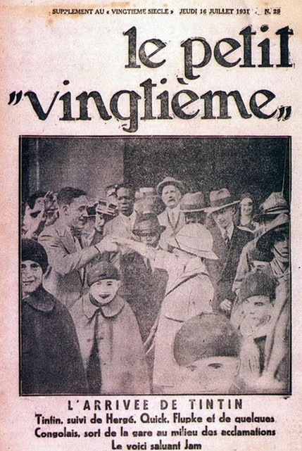 Une du Petit Vingtième du 16 juillet 1931, relatant la mise en scène de l’arrivée de Tintin de retour du Congo, en présence d’un jeune scout incarnant Tintin et d’autres dans le rôle de Quick et Flupke. Sont aussi présents Hergé et Paul Jamin, juillet 1931