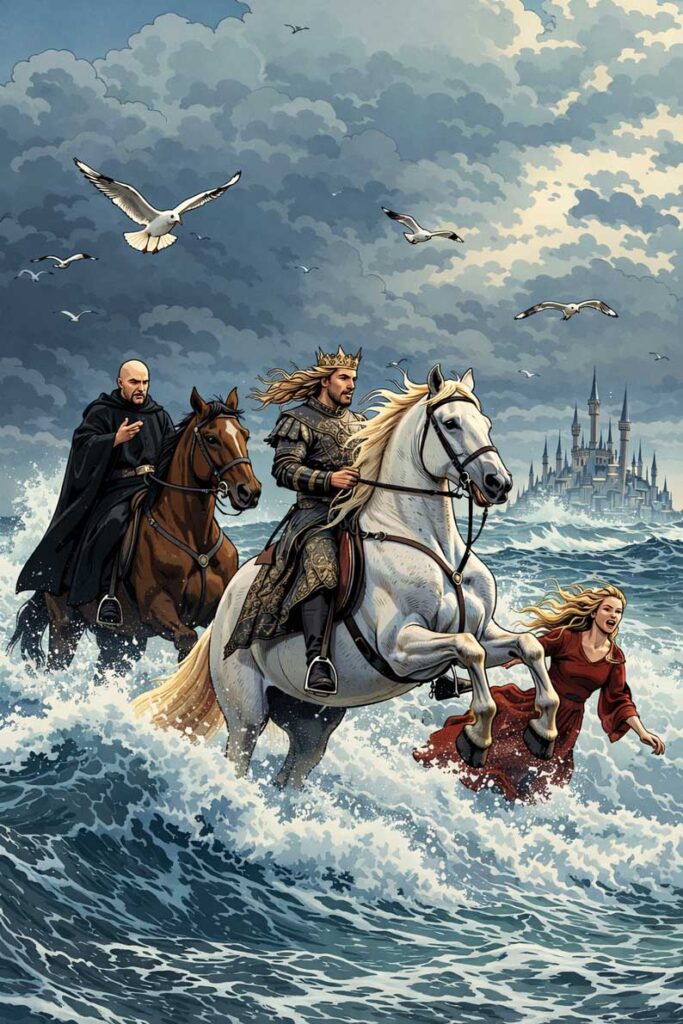 Gradlon fuyant à cheval, la mer aux trousses, et derrière lui la ville qui se défait. À Quimper, la silhouette du roi, figée entre les flèches de la cathédrale, pointe encore vers la direction du naufrage : signe public d’une mémoire qui refuse de dormir.