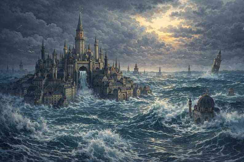 Ys n’est pas dissoute parce qu’elle serait « trop riche ». Elle se défait parce qu’elle a confondu l’or et la lumière. Elle a pris l’abondance pour une initiation, le vertige pour une élévation, l’excès pour une liberté. Elle a bâti sur le sable – non le sable géologique, mais le sable moral, celui qui ne supporte pas le poids d’un monde. Et dans ce sable-là, même les plus belles pierres s’enfoncent.