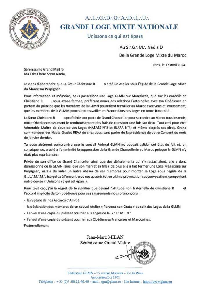 Face à cette mascarade générale, la Grande Loge Mixte Nationale suspend son traité d’amitié (voir courrier ci-dessous) et interdit à la GLMM l’accès à ses temples. La Grande Loge Mixte de France avec son grand Maître Félix Natali, suit le mouvement et rompt le traité avec la Grande Loge Mixte du Maroc lors de son Convent de juin 2025.