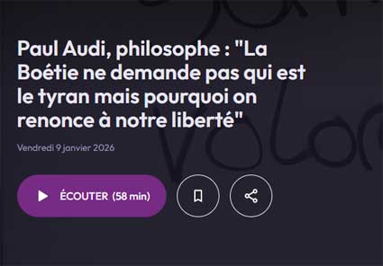 Pourquoi tant d’hommes consentent à leur propre servitude ? En 1576, paraît le fameux « Discours de la servitude volontaire » d’Étienne de La Boétie. Le philosophe Paul Audi revient sur ce texte qui l’a séduit à l’adolescence et en éclaire la portée philosophique et actuelle.