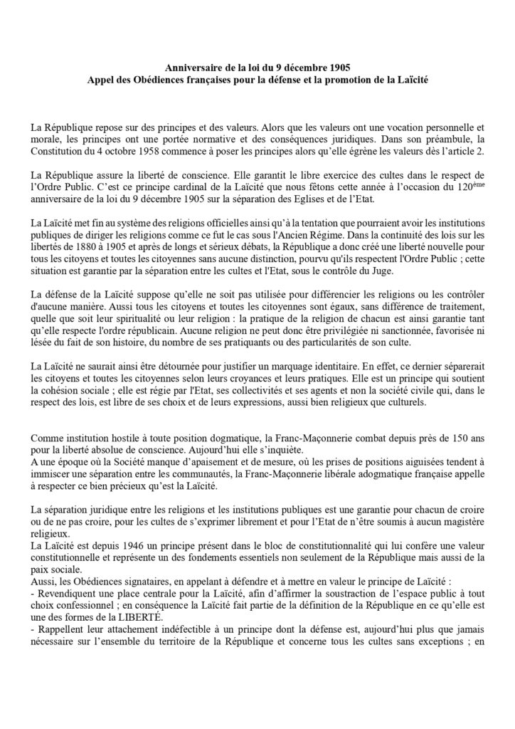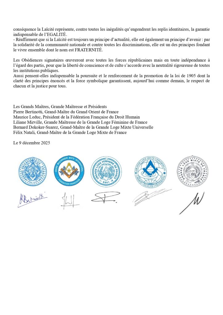 Le 9 décembre 2025, date-sceau, date-clef, cinq obédiences françaises ont posé un geste rare, simple, lisible : signer ensemble un « Appel pour la défense et la promotion de la laïcité », au moment même où la loi du 9 décembre 1905 fêtait ses 120 ans.