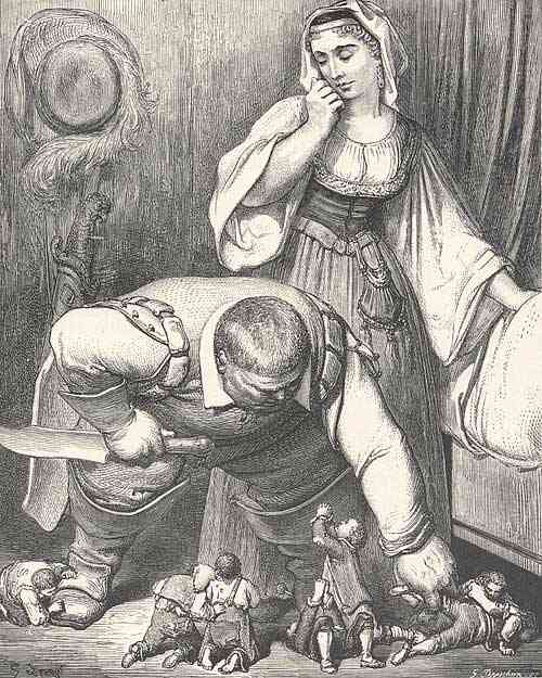 Dans la chambre à coucher se trouve deux lits, dont un est curieusement vide, comme si les 7 garçons étaient attendus, peut être inconsciemment espérés. Dans l’autre il y a les 7 filles de l’ogre endormies et portant des couronnes d’or, ce qui au demeurant n’est pas surprenant chez un ogre. Il ne peut être attiré que par ce qui brille, il ne connaît rien de l’or philosophique.