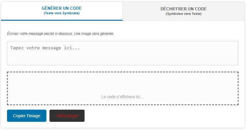 Pour illustrer, encodons « RENDEZ VOUS A MINUIT » dans l’onglet génération : l’outil produit une image de symboles que l’on peut copier. Pour décoder, dans l’onglet correspondant, cliquez sur chaque symbole du clavier virtuel pour recomposer le message. L’outil excelle pour des scénarios comme une chasse au trésor : générez un indice codé et fournissez l’accès au déchiffreur pour les participants.