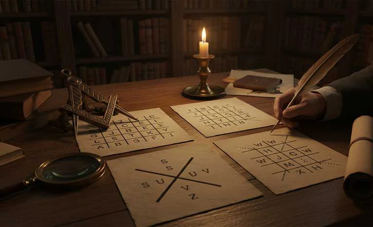 Le code franc-maçon remonte au 18e siècle, époque où il gagne en popularité comme chiffre de substitution monoalphabétique géométrique. Les Francs-maçons l’utilisaient pour consigner leurs rites et correspondances privées, les protégeant des regards profanes. Inspiré d’anciens systèmes hébraïques issus de la Kabbale, il fut également employé par les Rose-Croix et, plus tard, par des soldats unionistes lors de la guerre de Sécession américaine. Des traces en remontent aux Templiers, bien que leurs variantes soient souvent plus complexes. Le nom « Pigpen Cipher » (chiffre des enclos à porcs) provient de la ressemblance des grilles avec des enclos agricoles vus du ciel. Facile à apprendre en quelques minutes, il reste impénétrable sans la clé, ce qui en fit un outil idéal pour les sociétés secrètes.