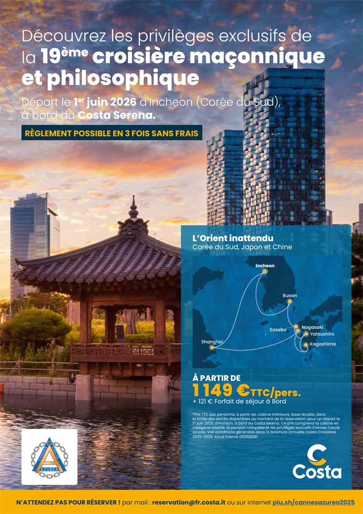 Embarquez pour un Orient inattendu, entre Corée du Sud, Japon et Chine, à l’occasion de la 19e croisière maçonnique et philosophique organisée par le Cannes Cercle Azuréa à bord du Costa Serena, du 1ᵉʳ au 12 juin 2026 au départ d’Incheon. Placée sous le thème inspirant « Natures et goûts du sacré », cette nouvelle odyssée propose aux Francs-maçons, à leurs familles et à leurs proches un voyage où découvertes culturelles, travaux symboliques et fraternité se répondent comme autant d’étapes d’un même chemin initiatique.