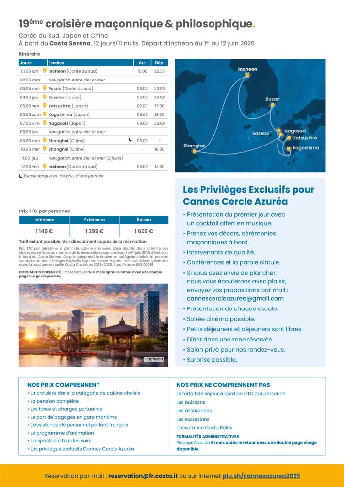 Cette 19e croisière maçonnique et philosophique est proposée à partir de 1149 € TTC par personne en cabine intérieure, 1299 € en cabine extérieure et 1669 € en cabine balcon, en base double, dans la limite des stocks disponibles au moment de la réservation, pour un départ le 1ᵉʳ juin 2026 d’Incheon à bord du Costa Serena. Ce prix comprend la croisière dans la catégorie choisie, la pension complète, les taxes et charges portuaires, le port des bagages en gare maritime, l’assistance de personnel parlant français, le programme d’animation avec un spectacle chaque soir, ainsi que les privilèges exclusifs Cannes Cercle Azuréa.