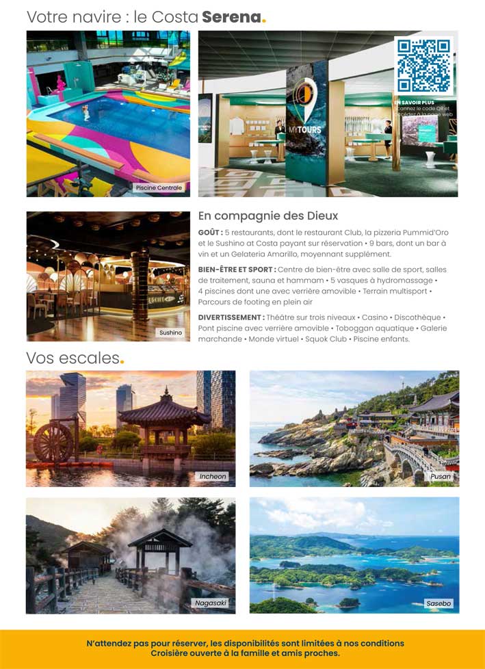 Pendant 12 jours et 11 nuits, le Costa Serena vous conduira au cœur d’un Orient à la fois moderne et empreint de traditions millénaires. Après l’embarquement à Incheon, en Corée du Sud, le 1ᵉʳ juin 2026, la croisière alternera journées de navigation propices à la réflexion et escales riches en symboles.