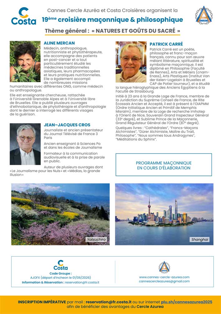 Les inscriptions sont impérativement à effectuer par mail auprès du service de réservation Costa ou via la page dédiée, afin de bénéficier des conditions spécifiques et des privilèges du Cannes Cercle Azuréa. Dans la continuité des précédentes éditions, cette 19e croisière s’annonce comme une nouvelle invitation à conjuguer voyage, réflexion et fraternité, sur un Orient où chaque escale devient un atelier à ciel ouvert pour celles et ceux qui cherchent à éprouver, au plus près, les multiples « natures et goûts du sacré ».