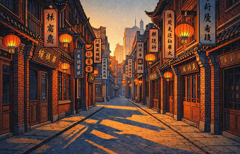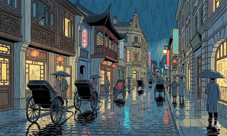 Nous retrouvons ensuite la ville, Shanghai, ses rues saturées d’enseignes, ses foules, ses silhouettes en mouvement, son tumulte calligraphié