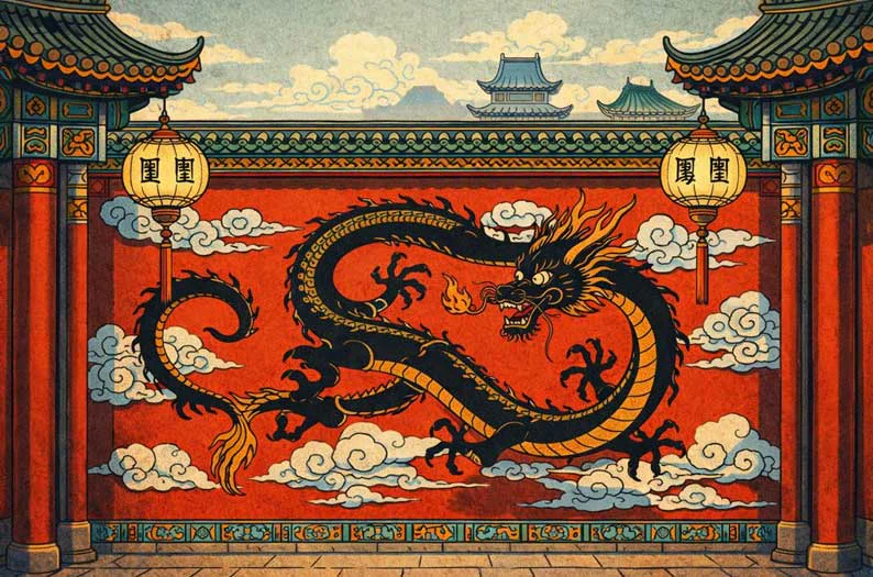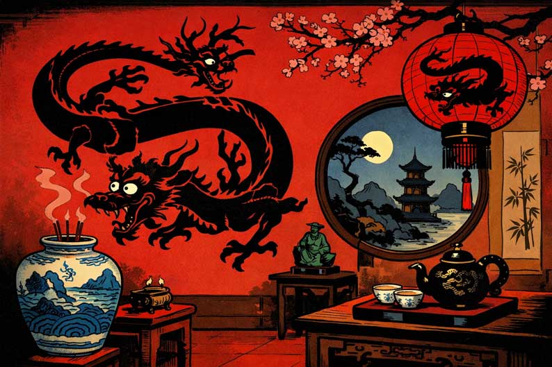 Nous y voyons un dragon noir qui se déploie en volutes, non pas décoratif mais agissant, presque respirant, et cette silhouette serpentine n’est pas seulement la promesse d’un exotisme, elle annonce une puissance de récit qui sait déjà que la peur est une langue universelle. Dans l’angle, une lanterne porte des signes qui brûlent sans flamme, et Tintin, minuscule dans son vase de porcelaine, paraît à la fois protégé et piégé, comme si l’aventure devait d’abord passer par un récipient, par un creuset, par une chambre close où la conscience apprend à distinguer l’image de la vérité. Cette entrée en matière, tout en aplats et en tensions, dit une chose décisive. Dans Le Lotus bleu, l’apparence n’est jamais innocente, l’apparence travaille, l’apparence ment, et c’est précisément pour cela que l’album devient une éducation du regard.