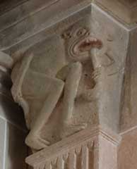 Dès le premier chapiteau à gauche, apparaît un démon courbé, aux pieds bifides et à la bouche hideuse et grande ouverte (photo 1). Un serpent traverse son corps de part en part, du fondement jusqu’à la bouche, et le malin en saisit les extrémités de ses deux mains.