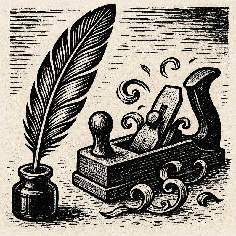 Le numéro se clôt avec « La Plume et le Rabot », rubrique littéraire confiée à Yonnel Ghernaouti, autour du trait de charpente, signé notamment par Pierre Delloye et Jérôme Carraz. La sauterelle, fausse équerre qui révèle les angles véritables, devient une métaphore précise de la pédagogie compagnonnique. Le détour par l’outil dit faux conduit à la rectitude du bois, comme si l’apprentissage devait accepter la rature et la reprise pour accéder à la justesse. Ces pages, discrètes et très fortes, ramènent au centre ce que tout le numéro démontre. La ligne tracée est mémoire, la mémoire devient geste, le geste devient homme.