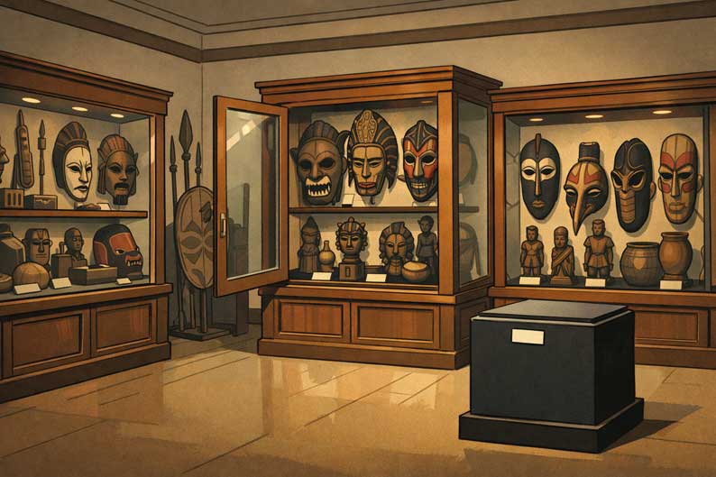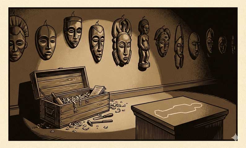 Tout commence dans un lieu de vitrines et de silence, un musée où les objets du monde semblent immobilisés dans une paix factice. La planche d’ouverture au musée ethnographique, avec ses masques, ses fétiches, ses totems alignés, porte déjà une question qui ne cessera de nous poursuivre. Que devient l’esprit d’une forme, lorsque la forme devient marchandise, collection, trophée, preuve sociale.