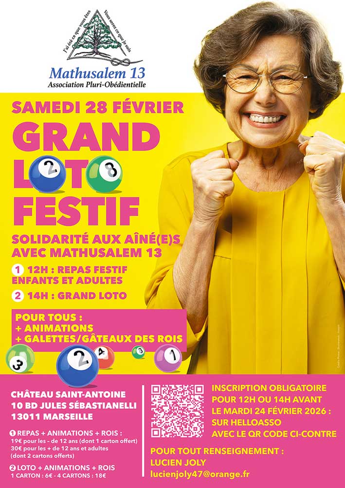 Le samedi 28 février 2026, le Château Saint-Antoine à Marseille va vibrer d’une énergie particulière. Rires, jeux, émotions et fraternité : Mathusalem 13 vous donne rendez-vous pour son Loto Festif, une journée placée sous le signe de la joie et de la reconnaissance.