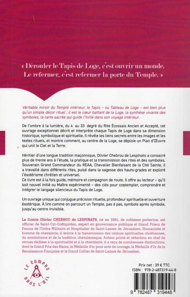 Dans cette lumière préfacielle, l’ouvrage de Olivier Chebrou de Lespinats, Tapis de Loge REAA du 4ème au 33ème degré, apparaît pour ce qu’il veut être, non une compilation mais un chemin de regard.