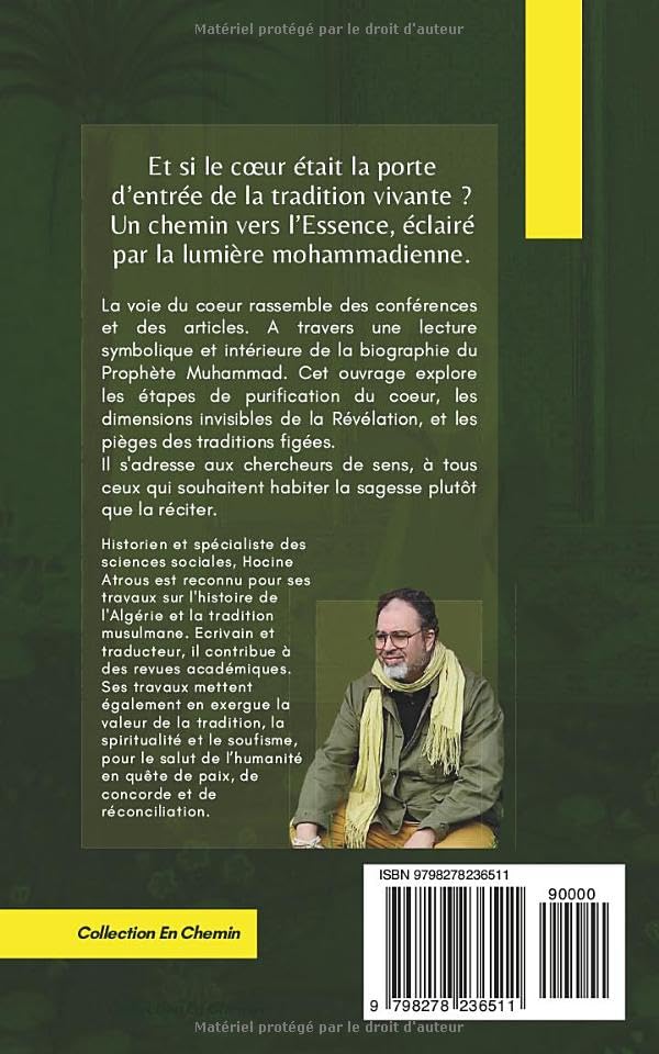Hocine Atrous est présenté comme historien et conférencier, avec une double formation théologique et universitaire. Diplômé de Université de l’Émir Abdelkader, il poursuit ses recherches à Université Lumière Lyon 2 et y obtient un master 2 en sciences sociales, spécialisation histoire. Cette double exigence façonne, dit le texte, la rigueur de sa pensée et l’ouverture de son regard. La notice insiste aussi sur son travail d’écrivain et de poète, sur une écriture nourrie de sources classiques et d’enseignements contemporains, visant à donner à voir un islam intérieur où la connaissance demeure inséparable de la transformation du cœur. Cette alliance entre rigueur et intériorité se ressent dans chaque page. Elle explique l’équilibre rare du livre, capable de parler de symbolique sans perdre la netteté, capable d’ouvrir l’ésotérique sans flatter l’obscurité.