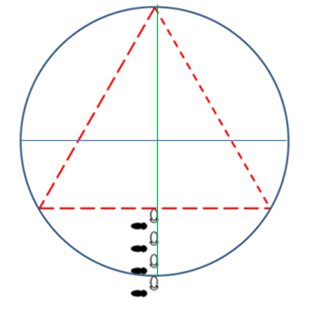 – Après les 3 pas de l’apprenti qui l’ont placé au milieu du rayon, et le changement de posture (maintenant dans ce cercle référentiel de 4 unités de diamètre, soit un rayon de 2, le demi rayon vaut 1 unité), faire le quatrième pas de côté qui rejoint l’extrémité du diamètre de ce cercle. À l’évidence ce pas est l’hypoténuse d’un triangle rectangle et comme nous l’a démontré Pythagore sa dimension est de √5  >>>> √(12+22)