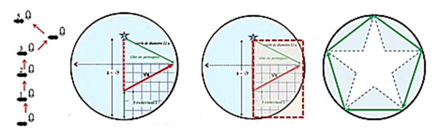 – Finir le pas en rejoignant le point ultime D du trajet qui est le sommet du diamètre du cercle inscrit dans le pentagone.