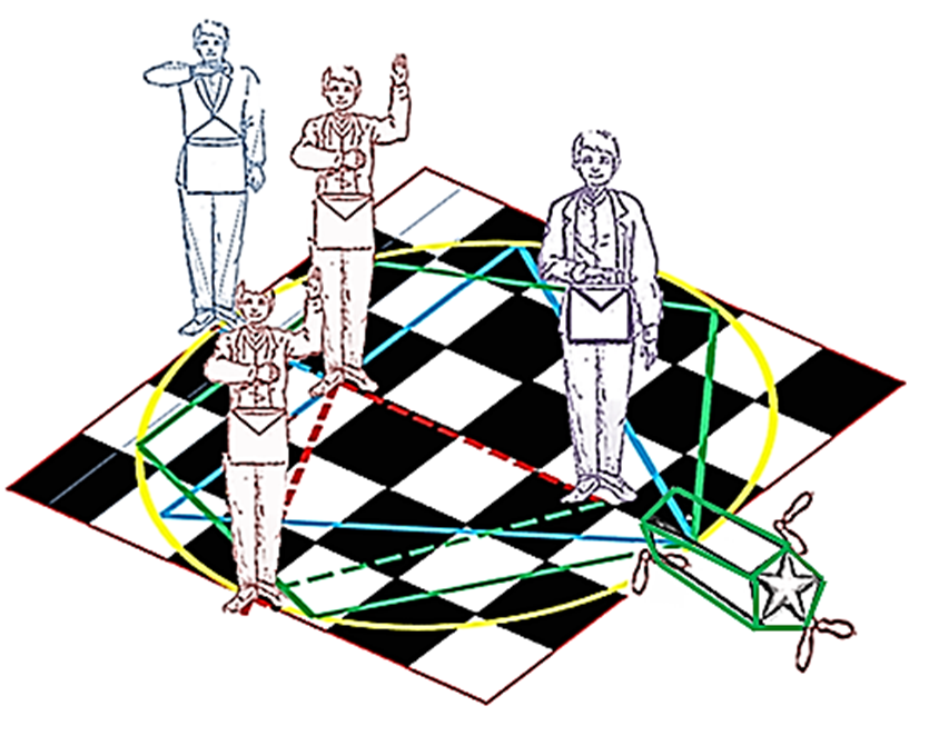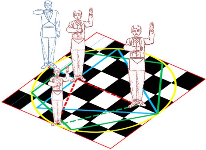 À l’ordre d’apprenti, glissés en équerre, les 3 pas mystérieux de la marche enseignés à l’apprenti sont à la fois une mise en mémoire corporelle des connaissances géométriques lui permettant de tracer le triangle équilatéral dans le cercle et la possibilité d’une marche droite, axiale en direction de l’orient.
