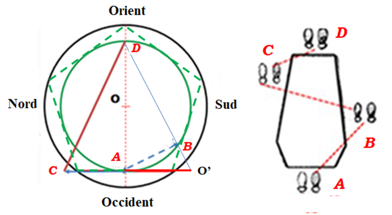 – Au point initial A, milieu du côté du pentagone, en partant vers le sud par le premier enjambement du cercueil, c’est le rappel de la connaissance du point B (coupure du cercle inscrit par la jonction du sommet du diamètre avec O’ quand OA= AO’).
