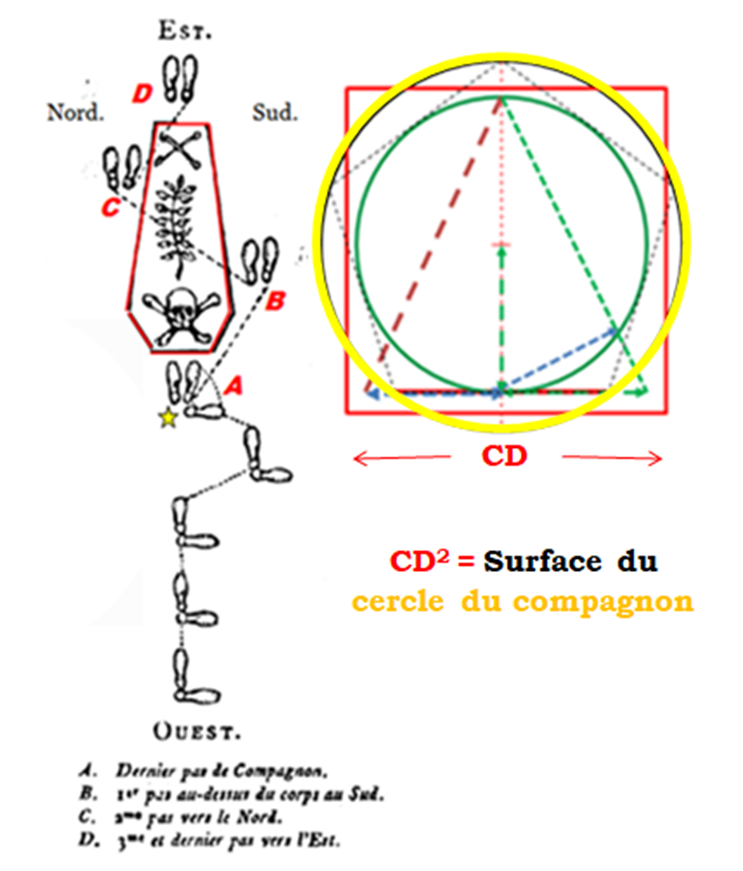 Le pas du Maître mémorise (dans leur mouvement alternatif droite gauche) comment trouver les points B, C et D qui permettent le tracé du carré (en rouge) dont la surface est égale à celle du cercle circonscrit du compagnon (jaune).