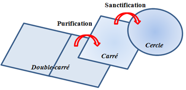 Le Maître Architecte se livre à une opération très particulière : celle qui consiste à convertir l’un des carrés du Double Carré en un cercle de même surface et qui permet ainsi de passer du Double-Carré  au  Carré  puis au  Cercle.
