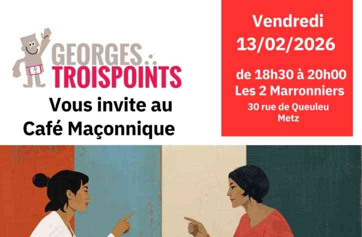 L’association Georges TROISPOINTS Moselle, composée de Francs-maçons initiés à la Fédération Française du Droit Humain organise chaque trimestre depuis 2016 un café maçonnique, ouvert à toutes et à tous. Cette rencontre qui aura lieu le vendredi 13 février à Metz, a pour vocation de permettre aux profanes — curieux, chercheurs de sens ou simplement désireux de mieux comprendre la Franc-maçonnerie — de poser librement leurs questions.