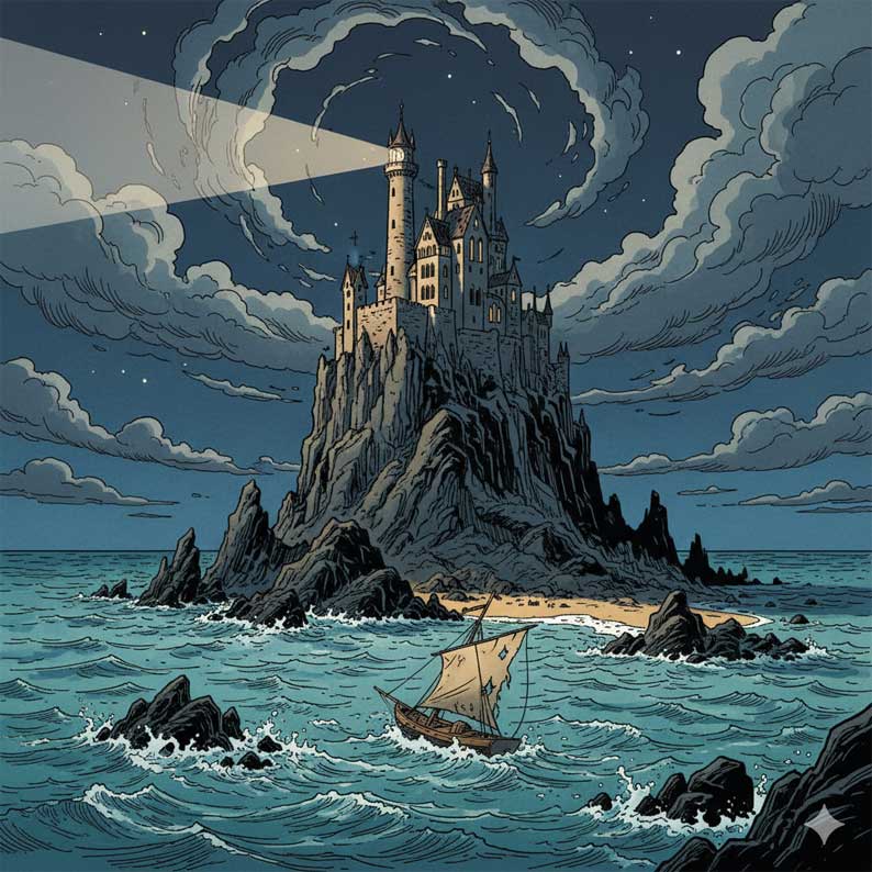 Forteresse, repaire, tour dressée, masse close, il attire l’œil comme une énigme. Nous ressentons une parenté avec ces architectures de l’inconscient où s’accumulent les peurs et les secrets, où l’esprit projette ce qu’il n’ose pas regarder en face. Il y a quelque chose de médiéval dans cette silhouette, mais la modernité y est tapie, car l’ombre ici n’est pas archaïque, elle est organisée. Elle sait utiliser les outils du temps. Elle sait se rendre efficace. Cela rend l’épreuve plus aiguë. Le passé et le présent s’y nouent, et nous comprenons que l’initiation ne consiste pas à opposer l’ancien au nouveau, mais à reconnaître comment l’ombre se déplace, comment elle change de costume, comment elle réinvente ses ruses.