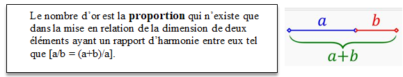 Cette proportion d’harmonie, dite aussi dorée, est une proportion analogique, a/b = (a+b)/a, elle vaut (1 + √5) / 2. (Rappelons que √5 est la valeur de la diagonale du rectangle de dimension 1 sur 2 appelé double carré).