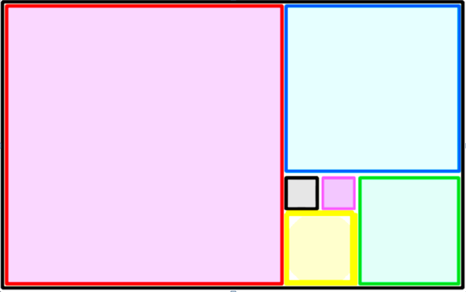 Une bonne approximation d’un rectangle d’or peut être construite à l’aide de carrés dont les côtés sont égaux aux nombres de la suite de Fibonacci. Le pavé mosaïque de dimension 5 sur 8 s’approche, ainsi, des calibres d’un rectangle d’or.