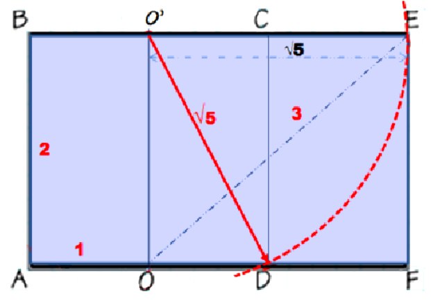 AB = 2 unités, AO = 1 unité ; la diagonale OE = 3 unités. Le rectangle ABEF obtenu est un rectangle d’or ; la longueur et la largeur sont dans un rapport du nombre d’or