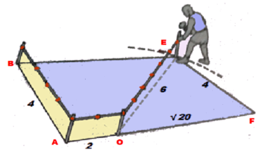 Le principe de ce processus utilisant le théorème de Pythagore, tracé avec règle et compas par le maître d’œuvre, est ensuite reporté au sol grâce à la corde à 13 (112 espaces)nœuds. Par exemple, en utilisant 4 espaces pour AB, 2 pour AO et donc 6 pour OE, on obtient un rectangle d’or ABEF .
