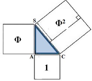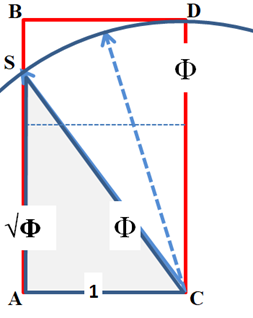 Dans un rectangle d’or ABCD, à partir de C, prendre comme rayon la longueur CD (Φ) et reporter le sur le côté AB qui donne le point S, sommet du triangle rectangle de Képler (SAC). Le côté AS2 = Φ2-1 = Φ soit AS = √Φ