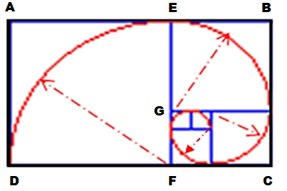 - Pour obtenir la spirale, tracer le quart de cercle de centre F et de rayon FD, le quart de cercle de centre G et de rayon EG,
