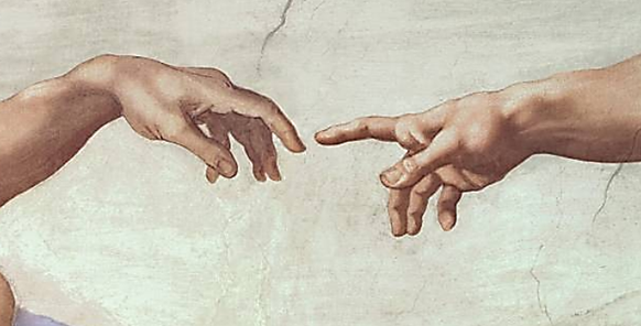 Spirituellement, dans la relation entre le Un et le Deux (√5) , entre le non manifesté et la dualité de la création, il y a un impossible à atteindre qui échappe à la raison, un inatteignable qui se montre dans l’infini des décimales de Phi encore à trouver, merveilleusement imagé par Michel Ange par la séparation des mains sur la Création d’Adam au plafond de la chapelle Sixtine.