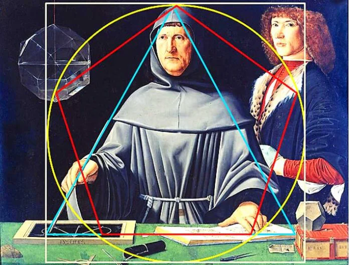 Ce sont des considérations de théologie chrétienne qui justifient aux yeux du moine Pacioli, dans son ouvrage la divine proportion, l’importance accordée à la dite proportion dont les caractéristiques concordent avec les attributs qui appartiennent à Dieu… Le premier est l’unicité… Le deuxième attribut concordant est celui de la Sainte Trinité ; c’est-à-dire que, de même qu’en Dieu une seule substance réside en trois personnes, le Père, le Fils et l’Esprit Saint, de la même façon, il convient qu’un même rapport ou proportion se trouve toujours entre trois termes. Troisième attribut : De même que Dieu ne peut se définir en termes propres et que les paroles ne peuvent nous le faire comprendre, ainsi notre proportion ne se peut jamais déterminer par un nombre que l’on puisse connaître, ni exprimer par quelque quantité rationnelle, mais est toujours mystérieuse et secrète, et qualifiée par les mathématiciens d’irrationnelle. Quatrième attribut : De même que Dieu ne peut jamais changer et est tout en tout et tout entier dans chaque partie, de même notre présente proportion est toujours la même et toujours invariable… Cinquième attribut : De même que Dieu confère l’être à la Vertu Céleste appelée Quinte Essence, et par elle aux quatre autres corps simples, c’est à dire aux quatre éléments Terre, Eau, Air et Feu… de même notre sainte proportion donne l’être formel au ciel même, selon Platon qui dans son Timée attribue au ciel la figure du corps appelé dodécaèdre… lequel ne se peut former sans notre proportion… et Pacioli de montrer les propriétés des cinq corps platoniciens circonscrits dans la sphère et le rôle éminent de la divine proportion dans la construction de deux d’entre eux : l’icosaèdre et du dodécaèdre.
