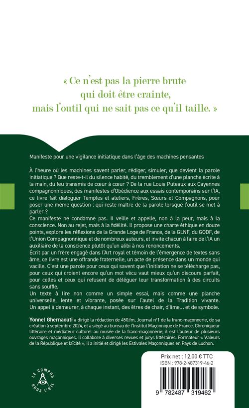 Yonnel Ghernaouti, chroniqueur littéraire, ancien directeur de la rédaction de 450.fm, ancien membre du bureau de l’Institut Maçonnique de France, médiateur culturel au musée de la franc-maçonnerie, formateur agréé « Valeurs de la République et Laïcité », écrit comme un veilleur qui refuse de s’habituer aux textes sans souffle. Son chemin d’auteur, déjà affirmé avec Pourquoi les francs-maçons veulent-ils reconstruire le Temple, publié chez Dervy en 2023, et avec Les grands mystères de la Franc-maçonnerie, coécrit avec l’historien de l’art spécialiste du Moyen Âge Jean-François Blondel et paru chez Dervy en 2024, porte la même exigence, transmettre une tradition sans la momifier, servir une lumière sans la confondre avec ses reflets. Avec La Franc-Maçonnerie à l’épreuve de l’intelligence artificielle, Yonnel Ghernaouti nous laisse un instrument de discernement, sobre et ardent, qui rappelle que la conscience ne se délègue pas.