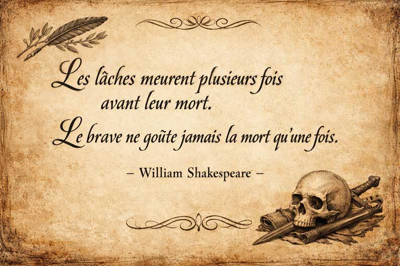 Dans cette parole de William Shakespeare (1564-1616) se joue bien davantage qu’une opposition entre peur et vaillance. Elle ouvre une méditation sur la manière d’habiter sa vie, de traverser l’épreuve, de regarder la finitude sans s’y dissoudre.