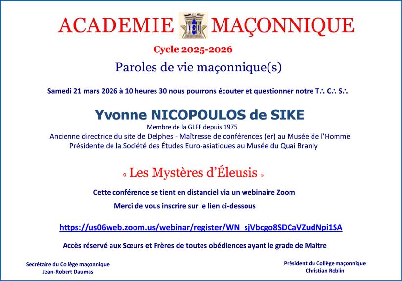 Ce webinaire est gracieusement accessible aux Sœurs et aux Frères de toutes Obédiences, titulaires du grade de Maître, sur inscription préalable : https://us06web.zoom.us/webinar/register/WN_sjVbcgo8SDCaVZudNpi1SA