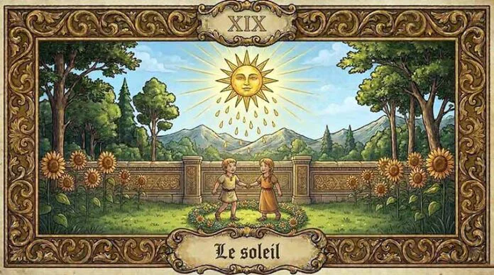 Le Soleil, arcane XIX – Après avoir traversé les mirages, les doutes et les peurs enfouies de La Lune (XVIII), l’initié voit enfin poindre l’aube. Les ombres trompeuses se dissipent pour laisser place à une lumière directe, franche et chaleureuse. Le paysage redevient un espace de sécurité et de fertilité : un muret protecteur, deux enfants unis qui se tiennent la main, et au-dessus d’eux, un immense Soleil rayonnant de face. L’épreuve de l’inconscient est terminée ; voici venu le temps de la pleine conscience, de la chaleur partagée et de la réussite éclatante – vous incarnez le Soleil.