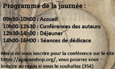 L’accueil se fera de 9 h 30 à 10 h 00. Les conférences des auteurs auront lieu de 10 h 00 à 12 h 30. Le déjeuner se tiendra de 12 h 30 à 14 h 00. Les séances de dédicace se dérouleront de 14 h 00 à 16 h 00.