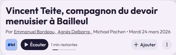 Installé à Bailleul, au cœur des Flandres, Vincent Teite, compagnon menuisier du Devoir, incarne l’esprit même du compagnonnage : excellence, humilité et transmission. Après un parcours riche en voyages et en découvertes à travers la France et l’étranger, il consacre aujourd’hui son savoir aux jeunes générations d’artisans.