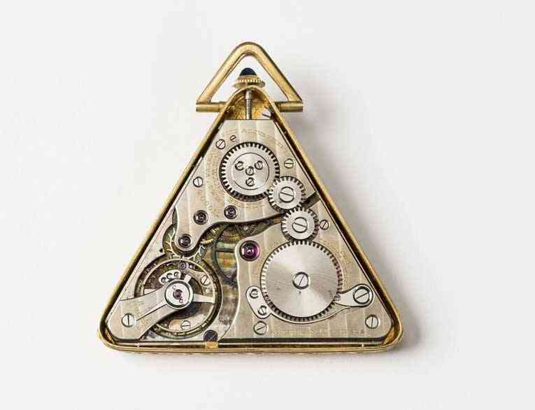 Du point de vue d’un horloger, la forme triangulaire présente des défis particuliers. « Un mouvement de montre est fondamentalement rond », explique Gadola. Dans le cas d’un réveil, un mouvement rond a été intégré dans un boîtier triangulaire. « En revanche, un mouvement triangulaire a été conçu pour une montre de poche ; c’est une grande rareté », ajoute-t-il.