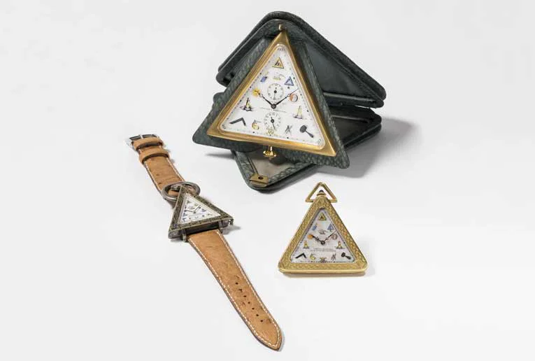 Présentation d’une pièce rare. Ce qui frappe d’emblée, c’est la forme triangulaire des montres. On peut notamment admirer une montre de poche maçonnique en or de Schwab & Brandt, Genève, datant de 1925. « Cette montre, ainsi que la montre-bracelet et le réveil exposés, ont tous été fabriqués pour des francs-maçons », explique Jasmin Gadola, responsable des collections du Musée de l’Horlogerie de Winterthur.