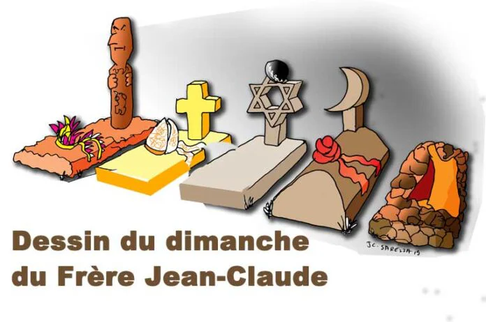 Cette semaine, notre dessin d’humour pointe ses crayons de couleurs sur nos Sœurs et nos Frères croyants ou non croyants de tous horizons. Le Frère Jean-Claude nous gratifie d’un dessin d’humour sur la fin du voyage de chacun de nous, en phase avec la Bible. Chacun pourra ainsi s’y retrouver.