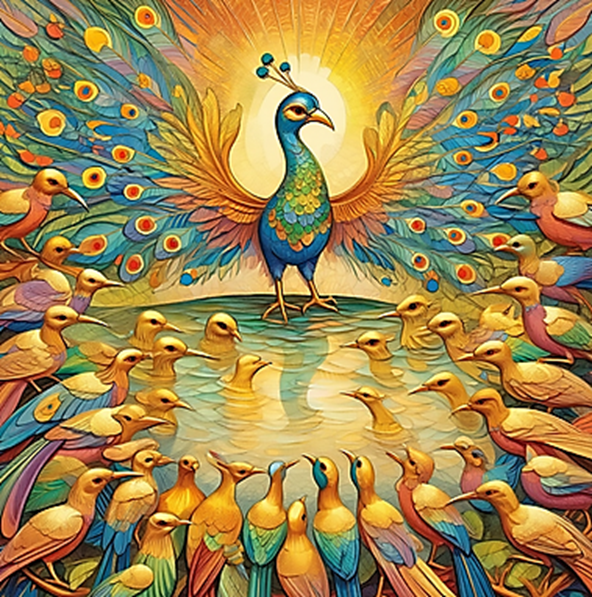 Le langage des oiseaux (Mantiq al-Tayr) de Farid ûd-Dîn Attâr est une épopée mystique qui retrace la quête d’oiseaux partant à la recherche de leur roi, la Sîmorgh. Partis par milliers, à la fin de l’épopée, seuls trente oiseaux parviennent au terme de leur quête et peuvent contempler l’oiseau sublime. À ce moment précis et par un subtil jeu de mots, la Sîmorgh devient le miroir de ces sî-morgh (trente oiseaux en persan) qui découvrent en l’oiseau qu’ils cherchaient le secret profond de leur être. Comme l’a analysé Henry Corbin, «Lorsqu’ils tournent le regard vers Sîmorgh, c’est bien Sîmorgh qu’ils voient. Lorsqu’ils se contemplent eux-mêmes, c’est encore Sî-morgh, trente oiseaux, qu’ils contemplent. Et lorsqu’ils regardent simultanément des deux côtés, Sîmorgh et Sî-morgh sont une seule et même réalité. Il y a bien là deux fois Sîmorgh, et pourtant Sîmorgh est unique, identité dans la différence, différence dans l’identité.» On retrouve ici le concept d’âme du monde identique à tous les êtres, tout en se manifestant à chacun d’eux de façon différente.