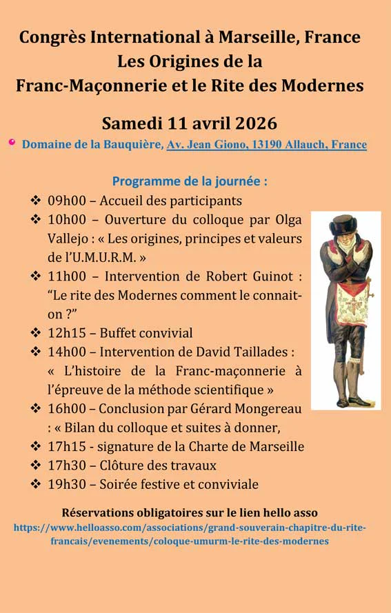 Le samedi 11 avril 2026, Marseille et sa région accueilleront un congrès international consacré à “Les origines de la Franc-Maçonnerie et le Rite des Modernes”, sous les auspices de l’Union Maçonnique Universelle du Rite Moderne, l’UMURM, et de son Académie du Vème Ordre. L’événement se tiendra au Domaine de la Bauquière, avenue Jean Giono, à Allauch, et réunira plusieurs institutions maçonniques françaises et étrangères autour d’un thème central pour l’histoire du Rite Français.