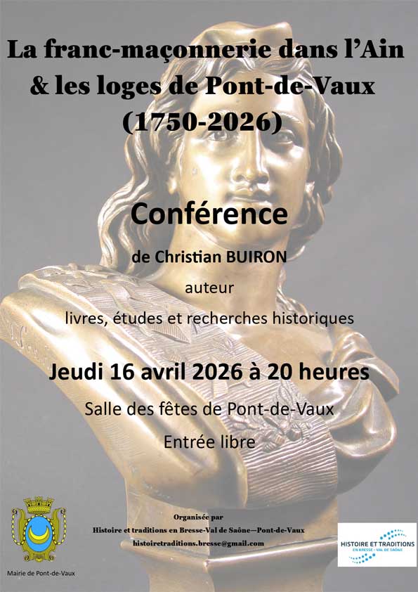 Le jeudi 16 avril 2026 à 20 heures, Christian Buiron donnera à Pont-de-Vaux (département de l’Ain en région Auvergne-Rhône-Alpes) une conférence publique consacrée à « La franc-maçonnerie dans l’Ain & les loges de Pont-de-Vaux (1750-2026) ».