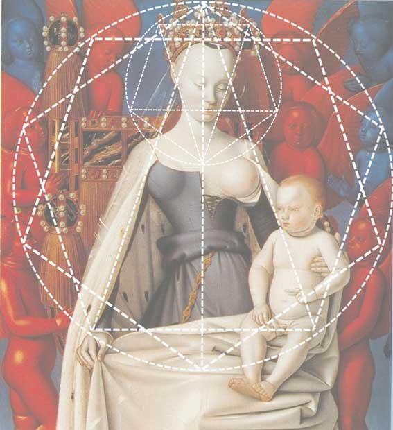 La composition est pensée, pesée, construite.Cercles, polygones réguliers, rapports de proportions, équilibre des masses, tout concourt à faire de l’image un espace gouverné par une intelligence supérieure de la forme. Cette géométrie n’est pas décorative. Elle est intérieure. Elle organise la circulation du regard, stabilise la scène, donne à la lumière sa puissance de manifestation. Chez Fouquet, voir revient toujours à être conduit. Le regard n’erre pas. Il chemine. Il est pris dans une architecture de sens.